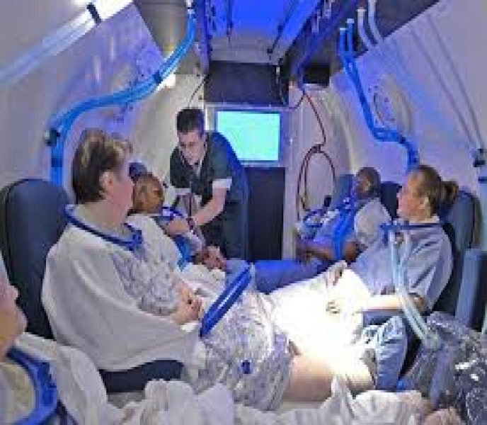ows a patient to lie in a chamber breathing 100% pure oxygen. This process allows your blood plasma to carry 15 to 20 times the normal amount of healing oxygen to the body's tissue. The oxygen enriched blood also enhances the function of white blood cells and encourages the development of new capillaries aiding in the wound healing process. Treatments take approximately 120 minutes, depending on your diagnosis."